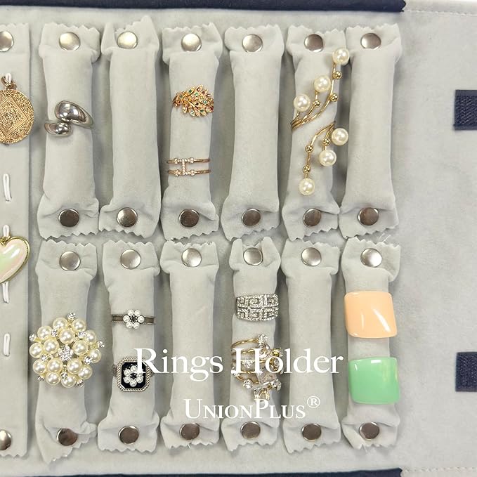 - Easy to use:Including 4 necklace/bracelet holders with button design, 5 bracket holders, 12 rings rows, and 3 rows of earring holders and 3 rows of pendant holders. Just hang your necklaces or bracelets on the holder and roll it up and use the hook-and-loop as closure