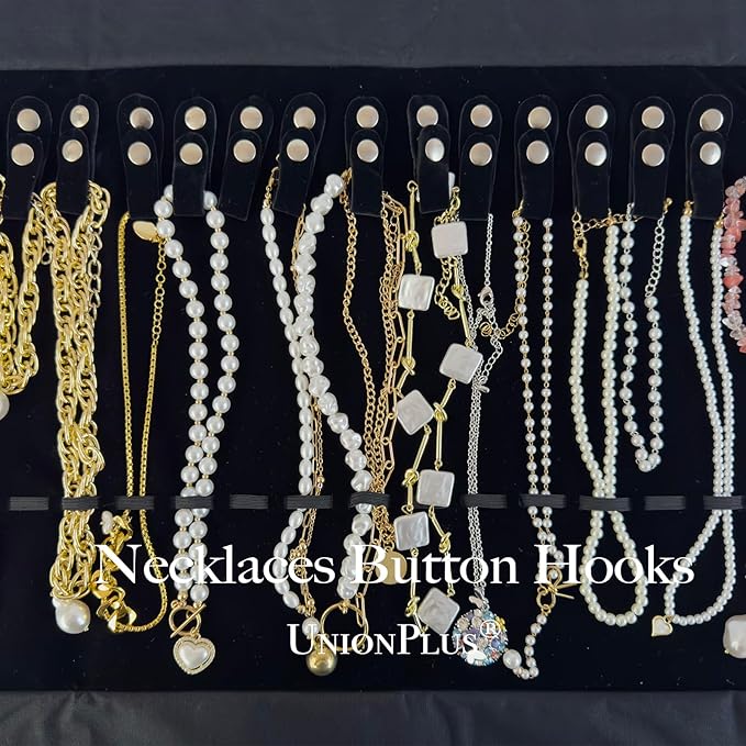 - Easy to use: Inside the roll, there are 16 necklace/bracelets holders with button design. Just hang your necklaces or bracelets on the holder and roll it up and use the hook-and-loop as closure