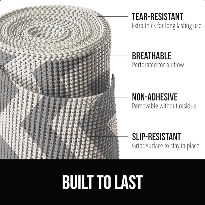 - EXTRA STRONG GRIP NON-ADHESIVE LINER: the Gorilla Grip powerGRIP liner is a non adhesive and tear resistant liner engineered with the highest quality materials to reduce slipping and bunching in your drawers or cabinet shelves; superior gripping technology keeps both the liner in place on surfaces