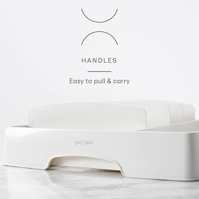 - EASY TO REACH: Built-in handles make it a cinch to grab and slide the whole organizer if you need to bring lids out for a closer look.