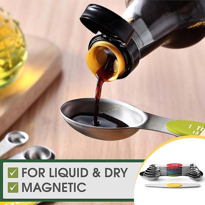 - Magnetic For Easy Use And Storage - These magnetic spoons let you use one spoon at a time and then they nest together for easy storage. Quickly grab the spoon you need without having to fumble with opening and closing a ring. They even have U.S. and metric measurement markings that are easy to read and won't fade or rub off.
