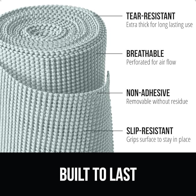 - EXTRA STRONG GRIP NON-ADHESIVE LINER: the Gorilla Grip powerGRIP liner is a non adhesive and tear resistant liner engineered with the highest quality materials to reduce slipping and bunching in your drawers or cabinet shelves; superior gripping technology keeps both the liner in place on surfaces