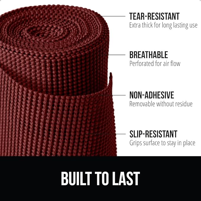 GORILLA GRIP powerGRIP Drawer Shelf and Cabinet Liner, Thick Strong Hold, Non-Adhesive Liners Protect Kitchen Cabinets and Cupboard, Bathroom Drawers, Easy Install, Breathable Mat, 12" x30', Red