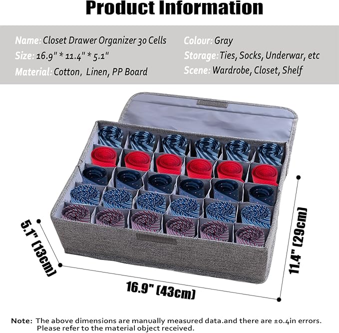 - ๐ใ1 Pack with 30 CellsใYou will receive 1 pc fabric clothes drawer organizer which mesures 16.9''*11.4''*5.1''. The closet drawer box has 30 individual cells, perfect for organizing socks, pantyhose, underwear, neck ties, scarves and other accessories. Keep clothes neat and orderly, perfect for organizing.