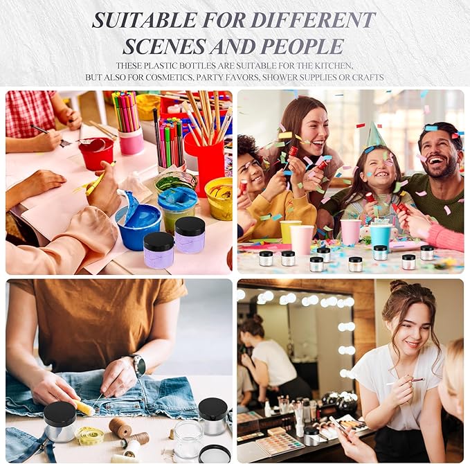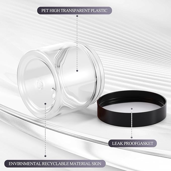 - Quality material: the 1.5 oz plastic jars with lids are made of quality clear plastic, without odd smell, does not contaminate your skincare products, stable, high temperature resistance, a black plastic cover with lid, sealed storage and leak proof