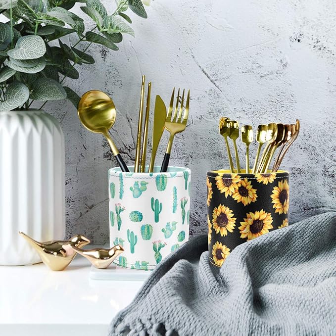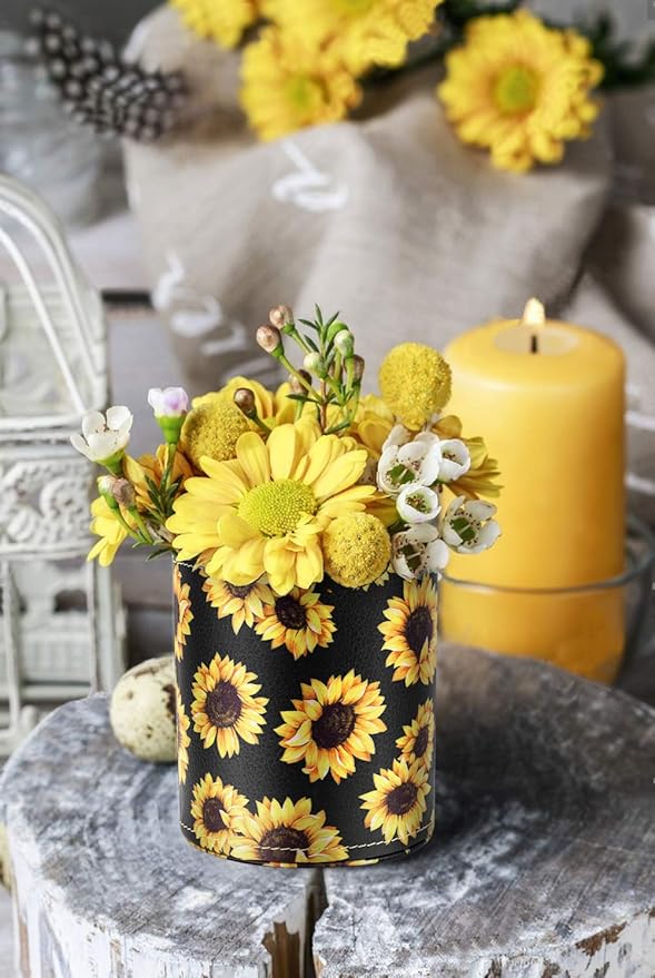 - Pen Holder Sunflower Design: New hot release design organizer cup, made of premium synthetic leather, it’s durable and sturdy. never fade away, makes your desk look fashionable and attractive.