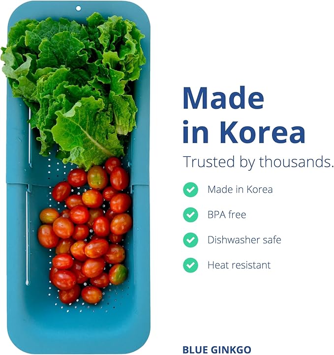 BLUE GINKGO Over the Sink Colander Strainer Basket - Wash Vegetables and Fruits, Drain Cooked Pasta and Dry Dishes - Extendable - New Home Kitchen Essentials (7.9 W x 14.5-19.5 L x 2.75 H) - Teal