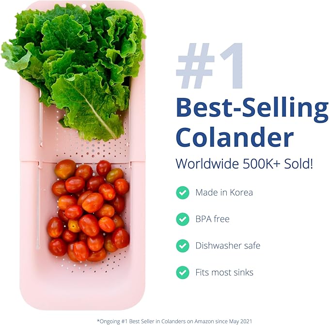 BLUE GINKGO Over the Sink Colander Strainer Basket - Wash Vegetables and Fruits, Drain Cooked Pasta and Dry Dishes - Extendable - New Home Kitchen Essentials (7.9 W x 14.5-19.5 L x 2.75 H) (Pink)
