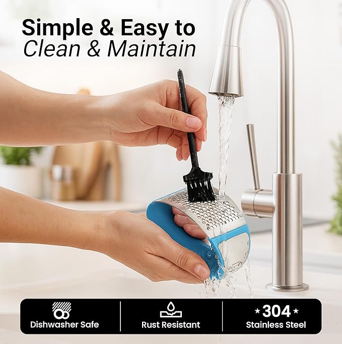 - ๐ง CLEAN IN SECONDS: This garlic press rocker can be cleaned by putting under a tap of running water and scrub with a soapy cloth or pop it in your dishwasher. Either way, it will come out 100% clean and free from garlic residue.