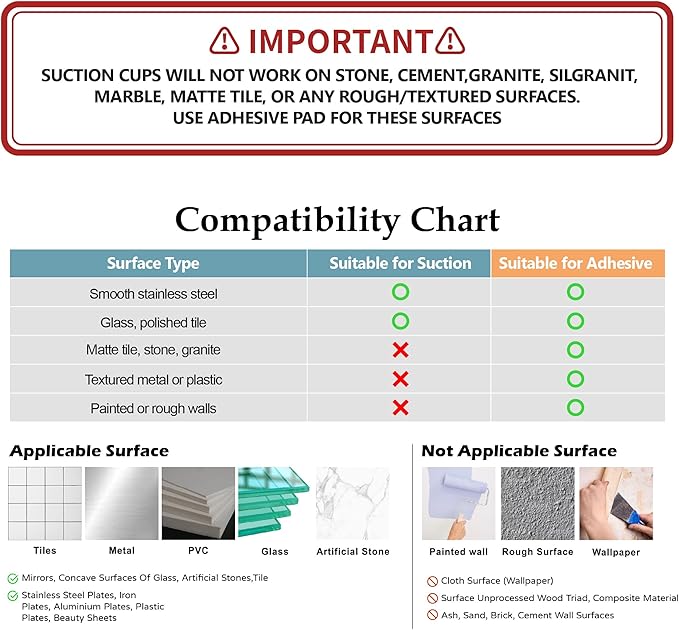 - Includes Basket + 2 Mounting Options (Adhesive Pad & Suction Cups) – Stainless steel basket comes with adhesive pad and suction cups. Compatibility Notice: Suction cups create an airtight seal and work ONLY on smooth, flat, clean, dry, non-porous surfaces (polished stainless steel, glass, glazed tile). On brushed/matte/textured stainless steel, curved, uneven, or porous surfaces, suction may slowly lose strength and detach—use the adhesive pad instead for secure hold.