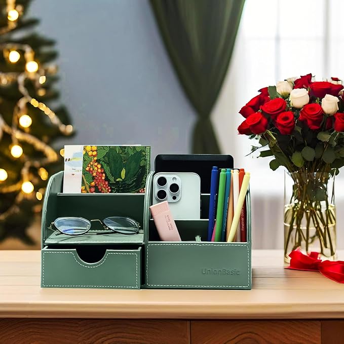 UnionBasic Desk Organizer, Multi-functional Leather Desktop Office Organizer, Pen Holder - Business Card/Pen/Pencil/Mobile Phone/Stationery Holder Storage Box, Malachite Green