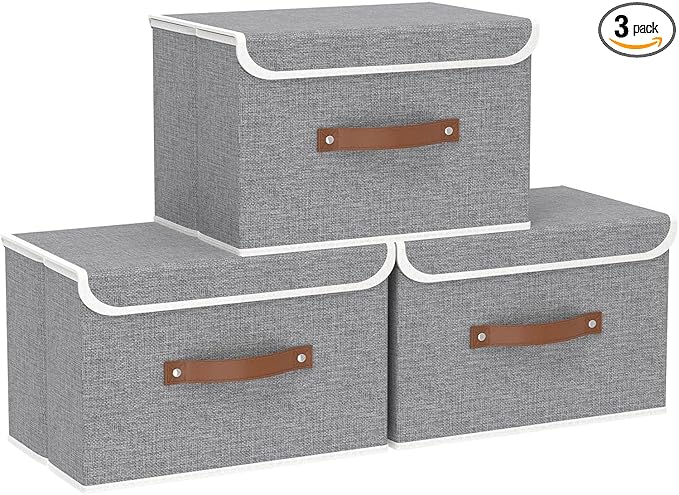 Yawinhe Collapsible Storage Bin, Cube Organizer Basket, Fabric Box with Lids, Washable and Leather Handle, for Home, Closet, Grey, 15.0''Lx9.8''Wx9.8''H, 3-Pack, USNK024GL-3