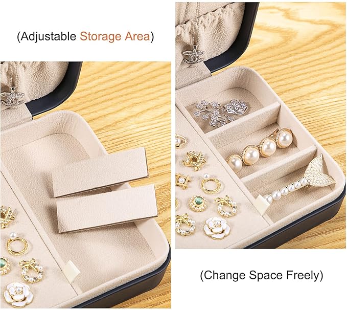 - Classify and Organize Jewelry: The jewelry box measures 8.26 (L) x 5.5 (W) x 1.7 (H), which is tiny in size but has a huge capacity. There are 3 tiny compartments on the right side with detachable dividers for various types of jewelry, 7 ring compartments for multiple rings, 1 earring card, a hidden compartment underneath for bracelets, bangles, etc., and 7 necklace hooks and 1 organizer pouch (to keep necklaces from becoming tangled in the top compartment)