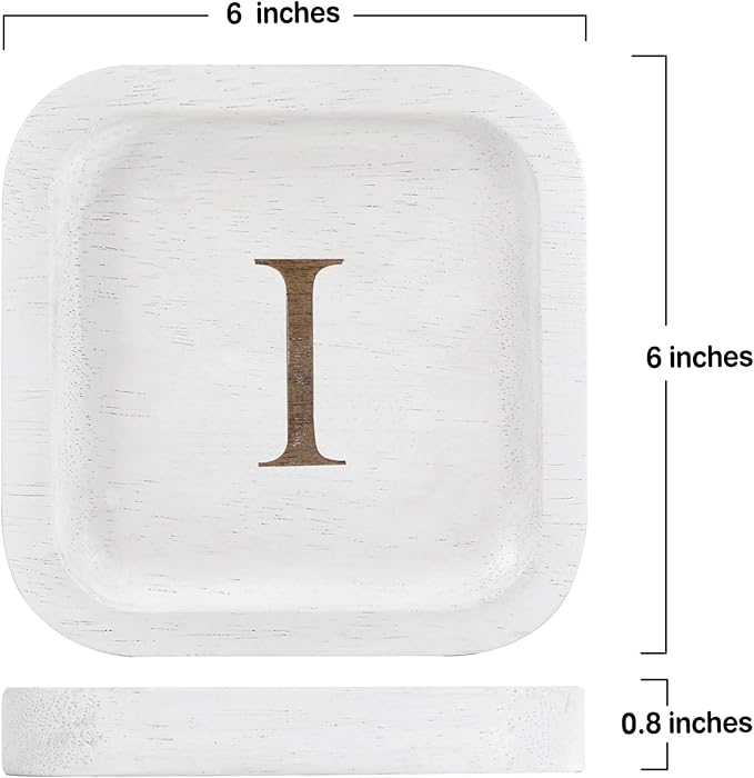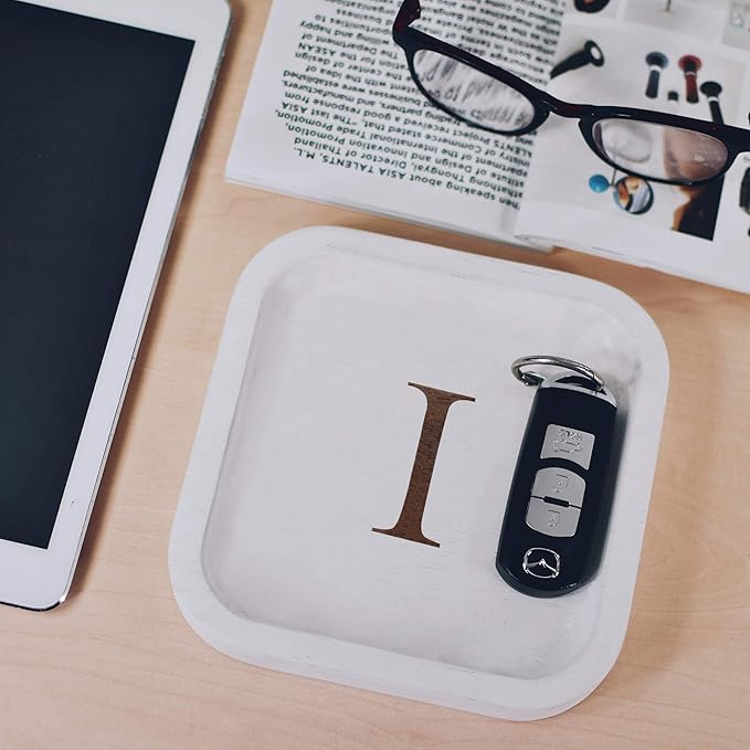 Wooden Personalized Letter Catchall Valet Tray Trinket Dish Jewelry Tray Key Bowl Decorative Plate Organizing Ring Earrings Necklaces Bracelet Watch Coins Wallet Holder (6"x6" Sq White "I")