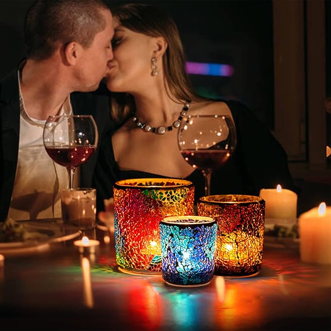 - ๐ Perfect Gift Set ใฝ๏ธ Made of long-lasting, leadfree glass, NO PLASTIC, ODORLESS. Each mosaic tealight candle holder with beautful light. You can place soy wax, dried flower and essential oil in it, make a beautiful aromatherapy candles for your friends, parents, lovers, reminds you and the family that love, joy lasts forever