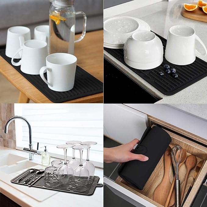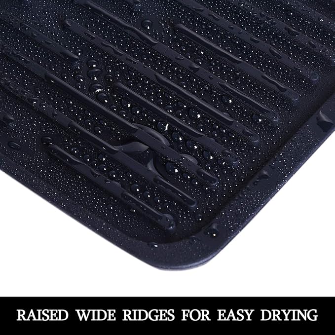 - PREMIUM QUALITY:Silicone dish drying mat size 16*7.8inch. Made of food grade silicone,BPA free,resists temperatures between -40°C to 230°C/-40°F to 446°F.Water ripple design has good anti-slip performance and is not easy to slide.