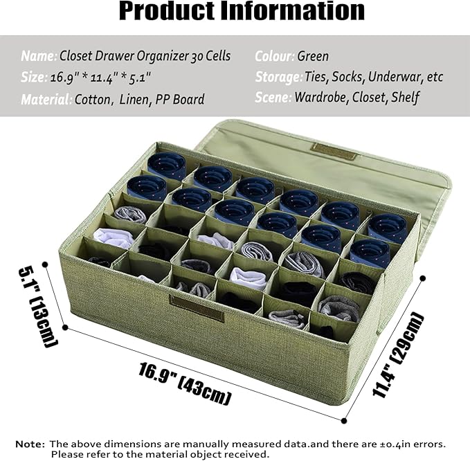 - ๐ใ2 Pack with 60 CellsใYou will receive 2 set clothes drawer organizers, each mesures 16.9''*11.4''*5.1''. Both of the fabric drawer dividers have 30 individual cells, perfect for organizing socks, pantyhose, underwear, neck ties, scarves and other accessories. Keep clothes neat and orderly, perfect for organizing.