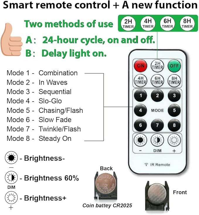- 17 Keys Including Dimming & Timer & 8 Flashing Modes Remote Contorol: Compared with the ordinary 13-key remote control function, our remote can not only adjust the brightness but also has 8 modes to choose from: combination, waveform, continuous, slow light, chase/flash, slow fade, flash/flash, constant light; In addition, we have added 4 timing modes (light off after 2/4/6/8 hours), giving you more choices