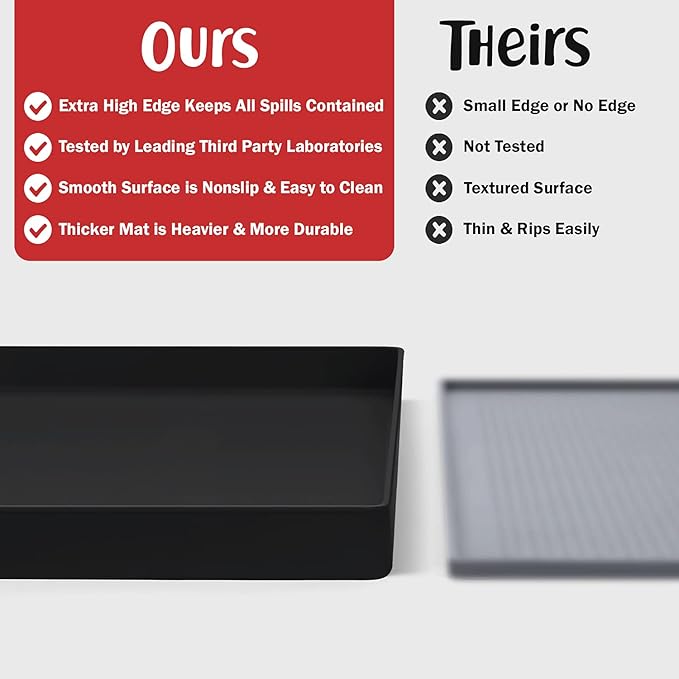 - Less Mess & Less Stress: Super high edge (0.6”) of DogBuddy Dog Food Mat keeps the spilled food and water on the mat and away from your beautiful floor. Silicone is naturally 100% waterproof, so what happens on the mat stays on the mat.