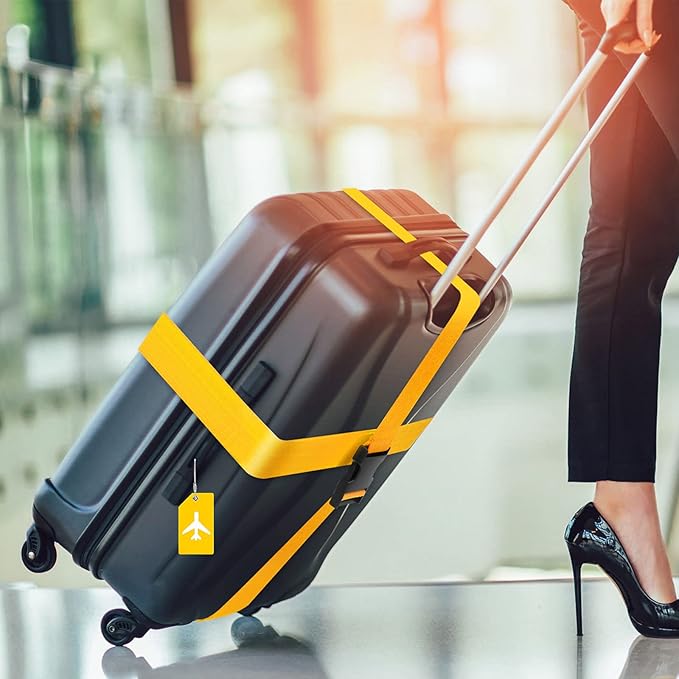 Weewooday 8 Pcs Luggage Straps Suitcase Tags Set for TSA Approved, 4 Travel Adjustable Suitcase Belt, 4 Silicone Luggage Tags with Name ID Card Travel Accessories(Yellow,Airplane)