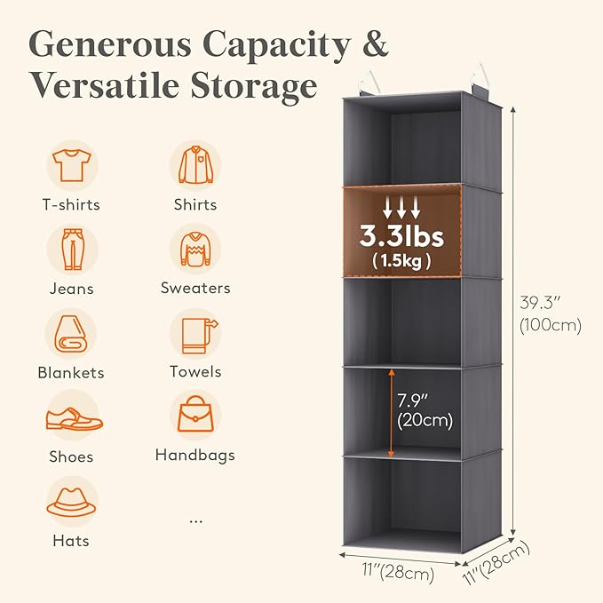 - Generous Capacity & Versatile Storage: Five shared 11" x 11" x 7.9" compartments (total 11" x 11" x 39.3") store T-shirts, jeans, sweaters, and bath towels. Total 7.5kg capacity (1.5kg/compartment) organizes diverse items efficiently