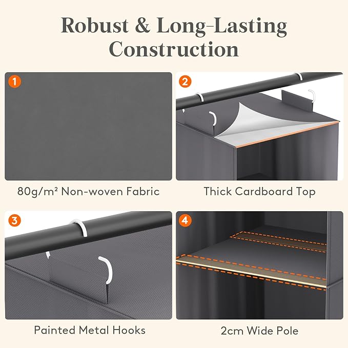 - Robust & Long-Lasting Construction: The hanging closet organizer is made from 80g/m² non-woven fabric with thick cardboard tops, painted metal hooks, and 2cm wide pole in each base. This sturdy design prevents clothes from collapsing