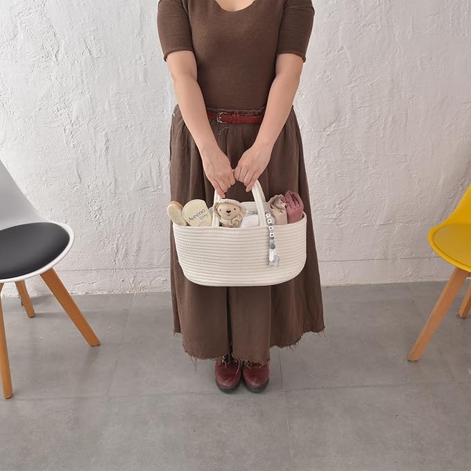 Baby Diaper Caddy Organizer for Girl Boy Cotton Rope Nursery Storage Bin Basket Portable Holder Tote Bag for Changing Table Car Travel Baby Shower Gifts Newborn Essentials Registry Must Haves White