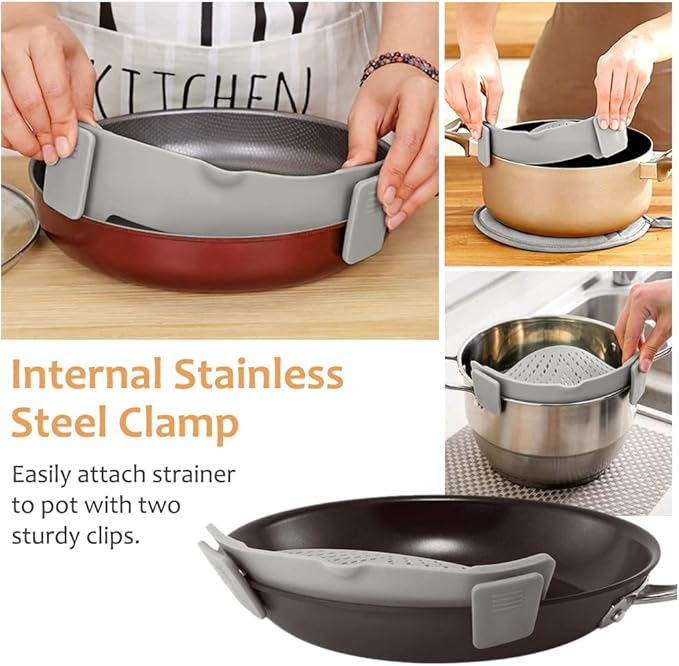 YEVIOR Clip on Strainer for All Pots Pan,Silicone Pasta Strainer Kitchen Gadgets,Collapsible Colander for Noodle,Vegetables,Fruit,Spaghetti (Grey)