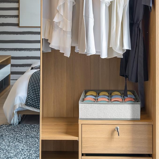 - 【Exquisite and Practicl】The 16-cell socks organizer for drawer is 11.8*11.8*3.5". With simple color and pattern, underwear drawer organizer fit well with your home. And the open design makes you find needed items easily.