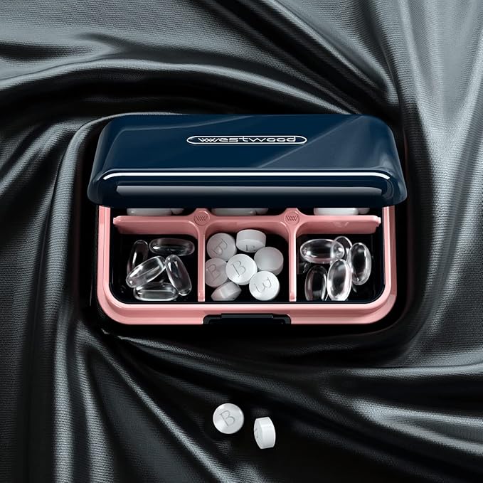 - 【Premium Travel Pill Box Organizer】- This pill box travels using a high-strength stainless steel mandrel with a smooth-running mandrel construction and a strong, durable switch that won't get stuck easily. The reinforced lock ensures that the vitamin organizer is always closed and will not automatically pop open, so there is no need to worry about pills getting mixed up or dropped in your computer bag, purse, pocket, gym bag or suitcase, ensuring easy access for every customer.
