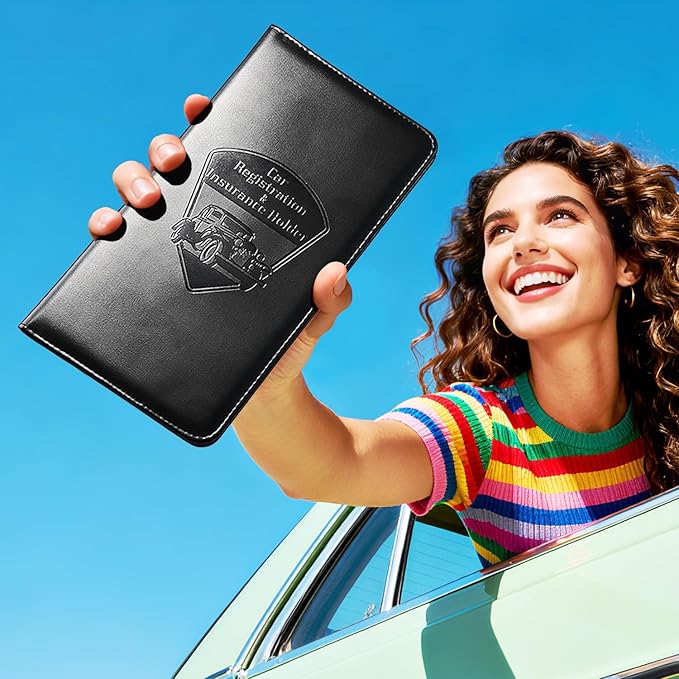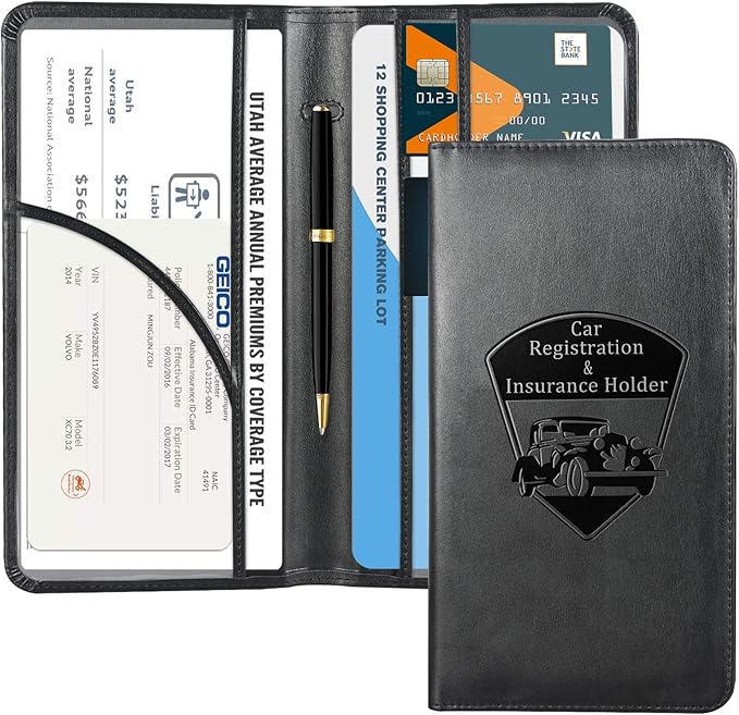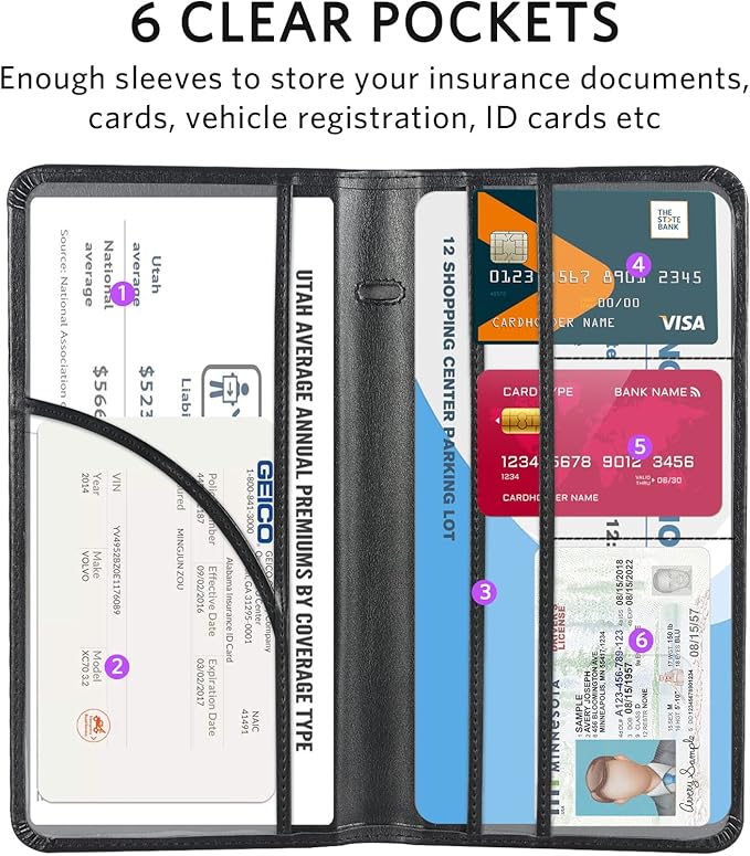 - WELL ORGANIZED: The car document holder offers solid protection and space for your essential documents. It comes with 2 large pocket for car registration and insurance documents, 3 small pocket for driver's license, ID cards, business cards, key contact information cards, receipts, and 1 middle pocket for other information.
