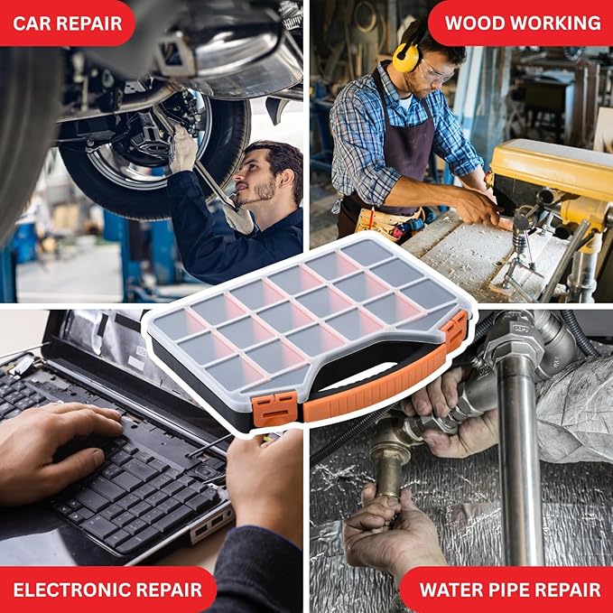- Tool Box Organizers and Storage – Multi-compartment hardware container works as a screw organizer, parts organizer, bolt organizer, nut and bolt storage box, and fastener sorter, keeping items secure in garage, workshop, or craft room