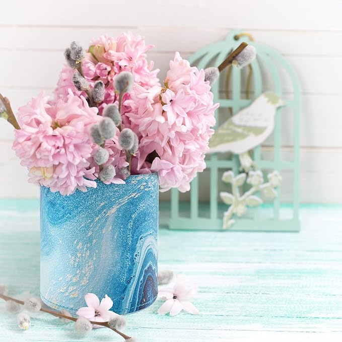 WAVEYU Marble Pen Holder for Desk, Pencil Organizer Office Decor, Large Makeup Brush Holder Pu Leather Multi-Functional Organizer Cup for Office, Home, Classroom, Blue Marble