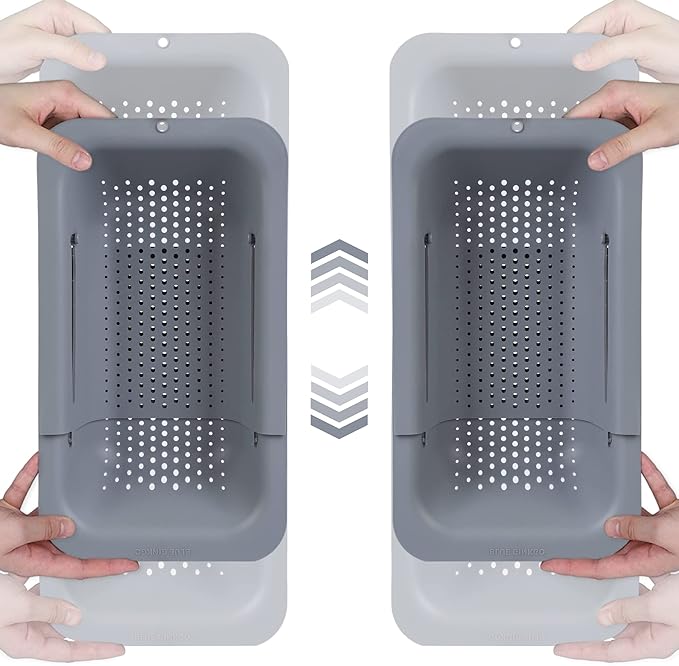BLUE GINKGO Sink Colander Baskets - (Pack of 2) Wash Vegetables and Fruits, Drain Cooked Pasta and Dry Dishes - Extendable - New Home Kitchen Essentials (2 Grey)