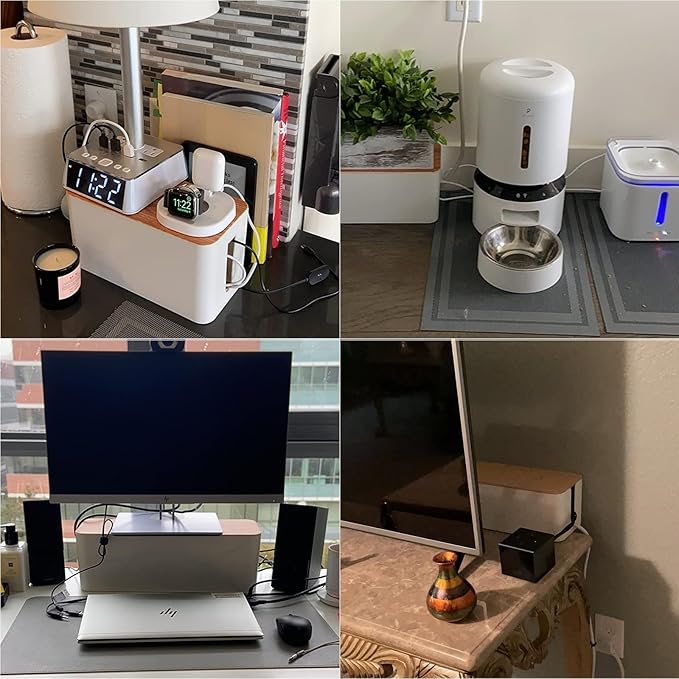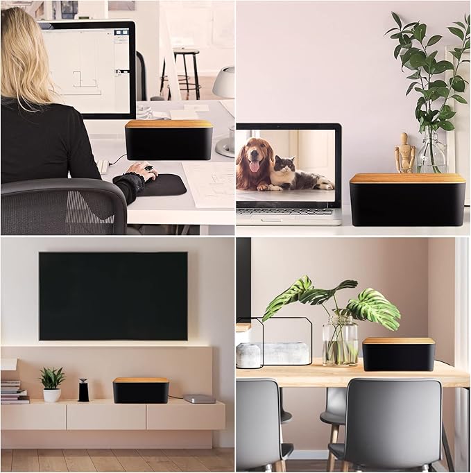 - 【Style Meets Practicality】With a stylish matte black finish and simulated wood grain, it will blend in with any decor.More stain-resistant than wooden lids, A home office and desk cable organizer conceals/protects cords and power strips which can help prevent power strips or electrical equipment or cords from touching carpet or flooring.