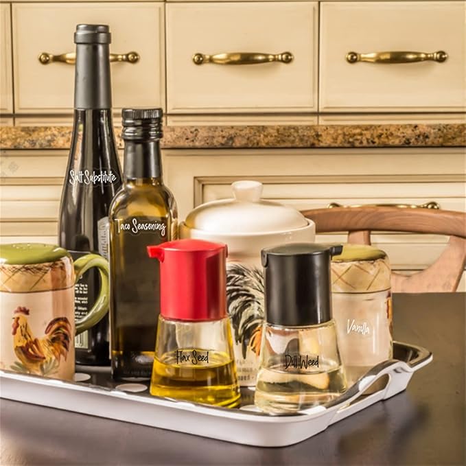 - Premium Quality: spice jars with labels are printed on a highly transparent PVC clear sticker. Water/oil resistant, not easily torn, able to be removed without leaving stains, keeps your reminders clear and sturdy. The high viscosity adhesive sticks well to food containers, plastic bags, etc. Dishwasher, microwave, and refrigerator safe