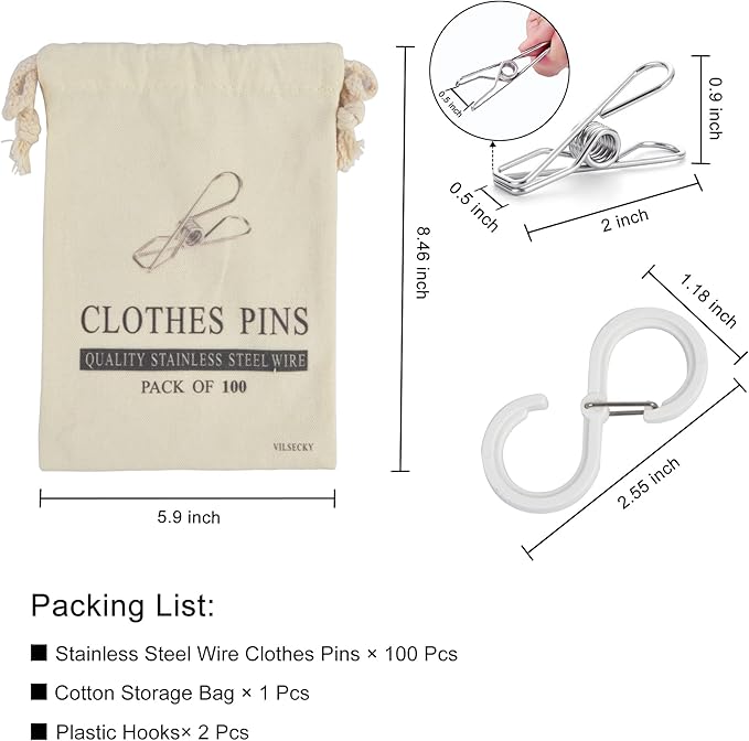 - Package Included : Our clothespins set comes with 100 Pcs stainless steel wire clips,appro size:2" x 0.5" x 0.9" (L x W x H),1 Pcs well-made cotton clothespins storage bag with drawstring,appro size: 8.46" x 5.9" (L x W),2 Pcs plastic hooks,appro size: 2.55" x 1.18" (L x W).The accessories-hanging storage bag and hooks will help to organize the clothes pins well and locate them where you need.