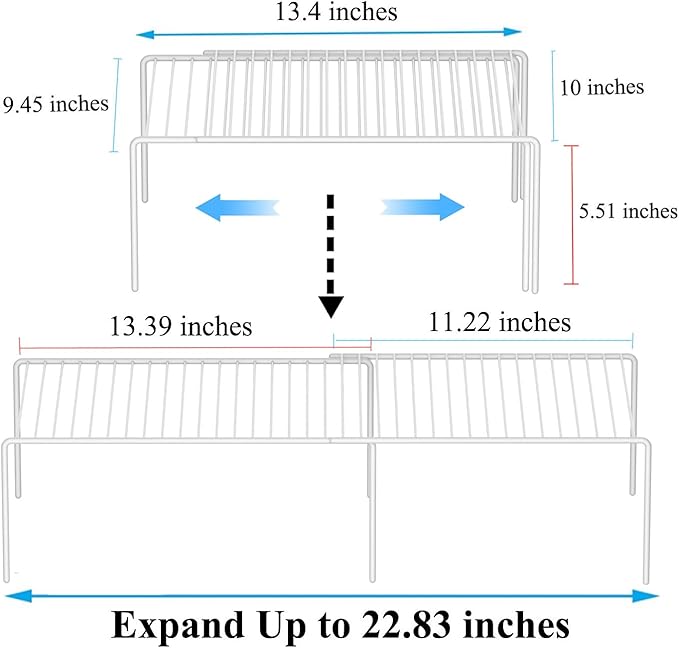 - ✅【Extendable Design】: The length of of this wire shelf can be extended to up to 22.83 inches, total measures 13.4 to 22.83" L x 10 " W x 5.51" H. Even the refrigerator and freezer also fits perfectly. Suitable height divides your dishes plates and bowls into two layers, Providing you with a neat and clean kitchen, solving the various of storage troubles.