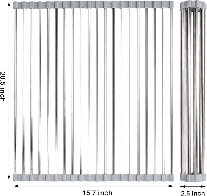 - Size : The size of the over sink dish drying rack is 20.5 x 15.7 inches. And you can also fold or cut the collapsible sink drying rack according to your sink size for better use. Please kindly measure your sink size firstly before purchasing this roll up dish drying rack over sink. A great helper for home accessories and kitchen necessities. With this small kitchen gadget, your kitchen and home will be much tidier and comfortable