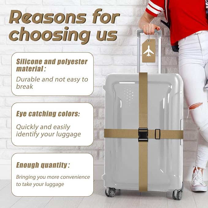 Weewooday 8 Pcs Luggage Straps Suitcase Tags Set for TSA Approved, 4 Travel Adjustable Suitcase Belt, 4 Silicone Luggage Tags with Name ID Card Travel Accessories(Khaki,Airplane)