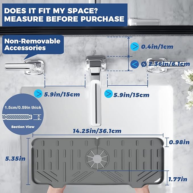 - 💪【FASTER DRYING】 Set of 2 pieces of silicone faucet mats. Size: 14.25" x 5.35" x 0.6", Ø 2.36" Diameter single faucet hole. Unlike other products, we have increased the size, thickness and weight of our products. The latest 5° slope design allows for faster and smoother water discharge and faster drying. This means no puddles to clean up & no water spots by the faucet.