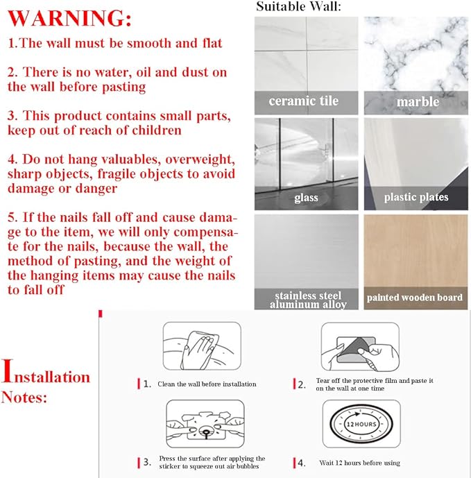 - ★Notes★: Please make sure that the wall is smooth, clean and free of moisture before pasting, and wait 24 hours before using it