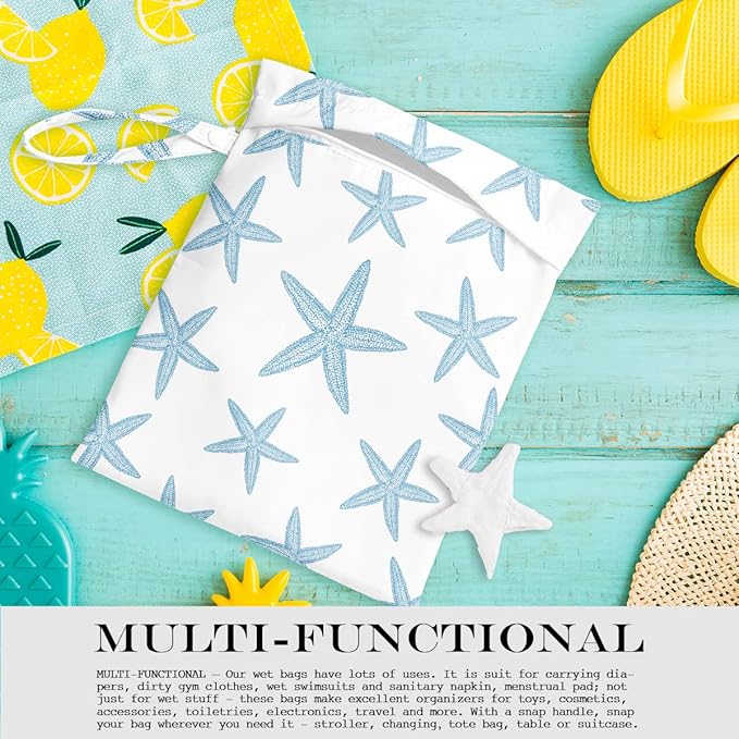 - ๐ MULTI-FUNCTIONAL โ Our wet bags have lots of uses. They are suit for carrying wet swimsuit bag diapers, wet swimsuits and sanitary napkin, menstrual pad; not just for wet stuff - these bags make excellent organizers for toys, cosmetics, accessories, toiletries, electronics, travel and more. With a snap handle, snap your bag wherever you need it - changing๏ผsuitcase, table or tote bag.