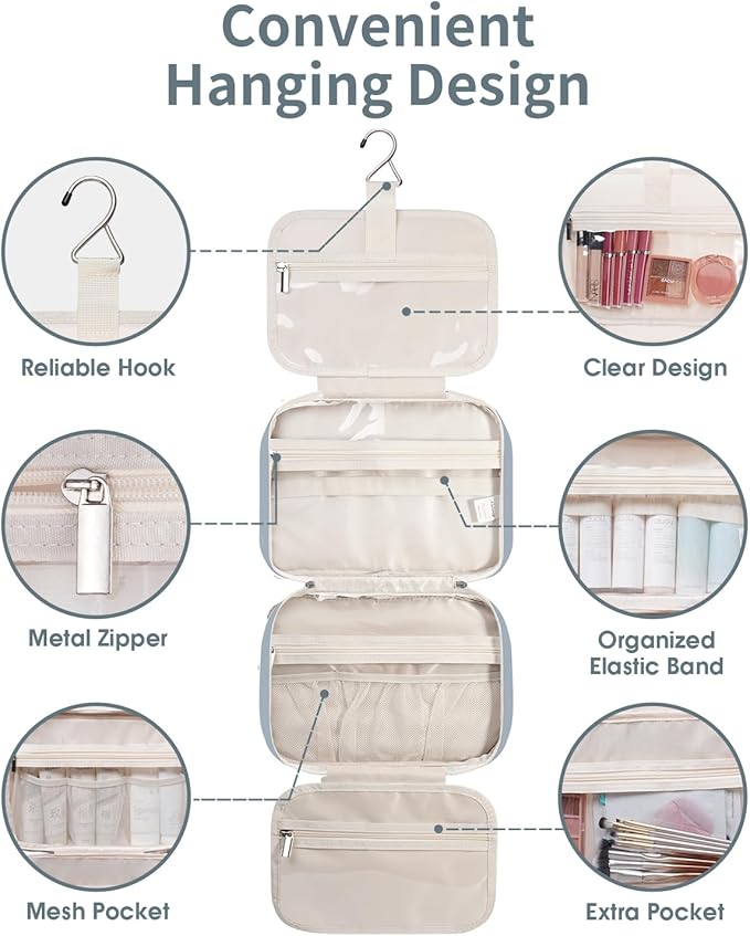 - NOT BULKY DESIGN - Large Capacity yet compact design, weighing 16 ounces. large metal hook allows hanging the toiletry case from towel rack, coat hook or wherever is available, making your toiletries and cosmetics displayed well for easy access