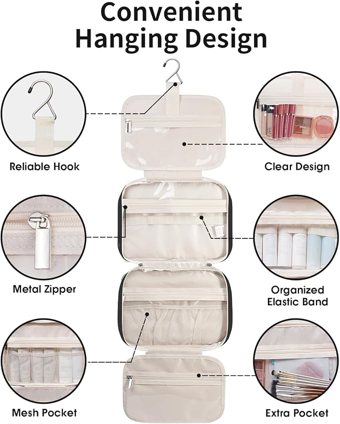- NOT BULKY DESIGN - Large Capacity yet compact design, weighing 16 ounces. large metal hook allows hanging the toiletry case from towel rack, coat hook or wherever is available, making your toiletries and cosmetics displayed well for easy access