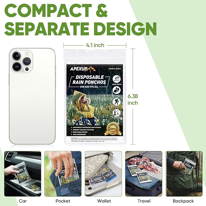 - [VERSATILE APPLICATION] APEXUP disposable rain poncho adult will keep you dry for outdoor activities of any kinds such as hiking, camping, picnic, theme park, and outdoor game watching. Great gift idea for hunting gear for men, rain gear, or bushcraft gear.