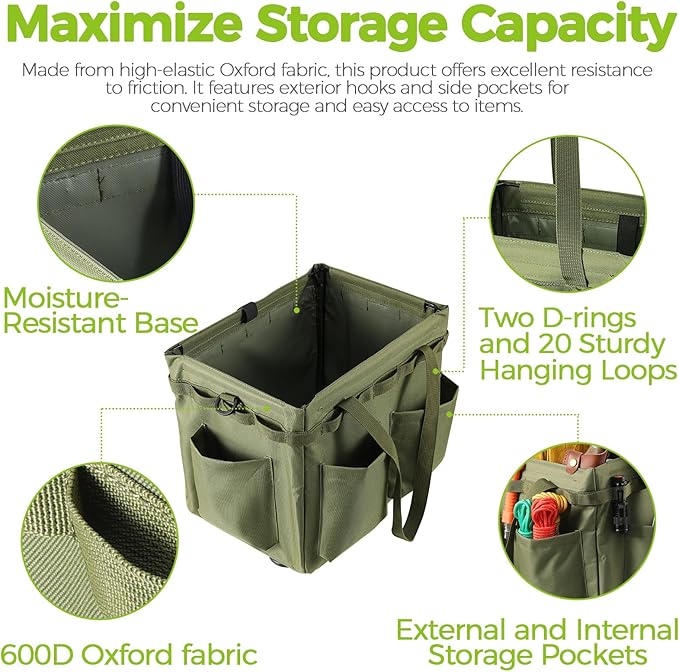 - ✔【Trendy Design】The Car Organization Container is equipped with 20 Hanging Holes and 4 Utility Pouches thoughtfully placed around the bag, ensuring an optimal and efficient distribution of load without occupying internal space. This camping basket is available in four colors: black, khaki, camouflage, and green, and each color is visually appealing and attractive.
