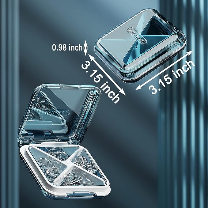 - PORTABLE SIZE: This premium pill holder comes with stylish & clean design, you can carry it around at anywhere with confident! Small size, convenient to carry! You can use this daily portable pill box at home, at work or while traveling. The size of this compact pill box is 3.15 x 3.15 x 0.98inches, it's compact enough, can be easily placed in your wallet, suitcase, backpack, handbag, even your coat pocket.