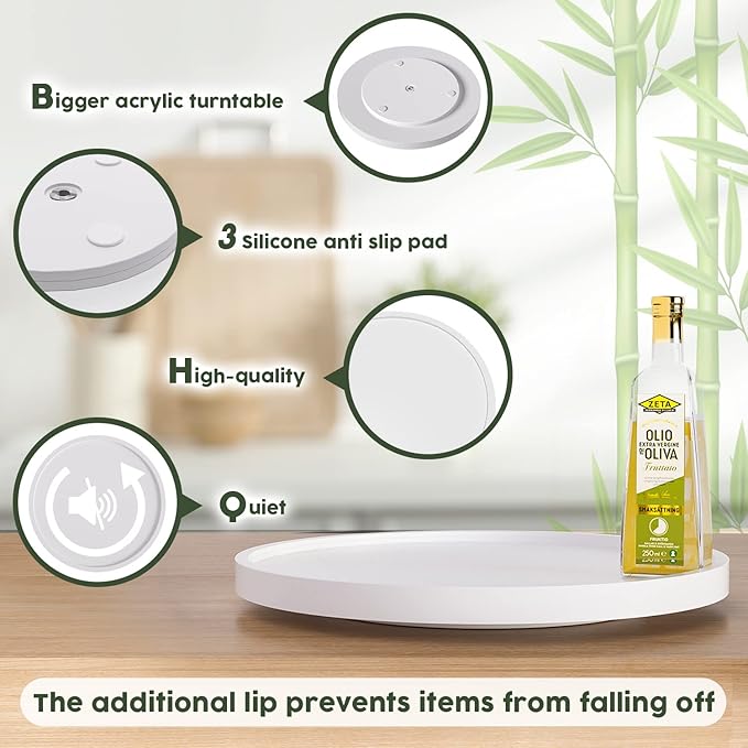 - Updated Design: Bigger acrylic turntable with 3 silica gel skid prevention pad makes lazy susan organizer rotate smoother and quieter. You can get any item from any angle. The additional lip prevents items from falling off