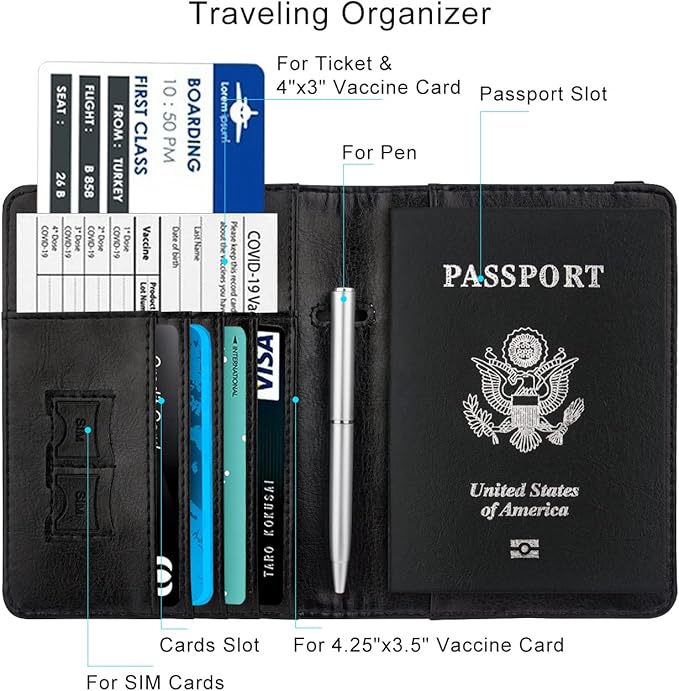 - Practical Travel Accessories: This passport cover and card wallet has multiple slots to hold business cards, credit cards, cash, boarding passes sufficiently, two SIM slots for SIM cards, a pen slot for pen. Allows convenient access to information during boarding and transit